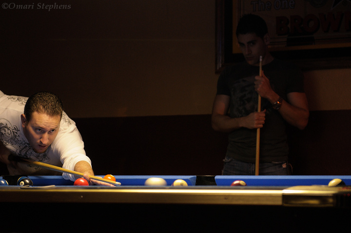 Near the end of a very busy Friday, I encountered a serendipitous opportunity to shoot some pool, in a sense.  Inspired by some shots from my friend Brandon this past week, I tried to focus on capturing the motion of the game while still keeping the faces sharp.  In the 15 minutes that followed, I ended up shooting the two best pool photos I've ever taken.