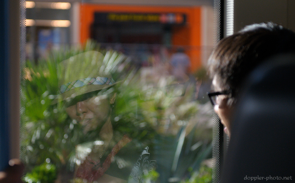 People split into smaller activity groups for Friday afternoon.  Above, Emily (left, reflected) and Tsu (right) look out of a bus window as we ride it to the outlet mall at the end of the line.
