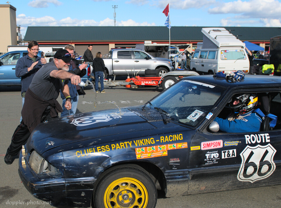 In this case, the Clueless Party Viking team got the party started after a 12th-place overall finish (out of 171 cars that started the race). True to form, the first celebration was emptying a 1-pint can of Coors Light onto the hood of the car, after which the driver got one to drink.