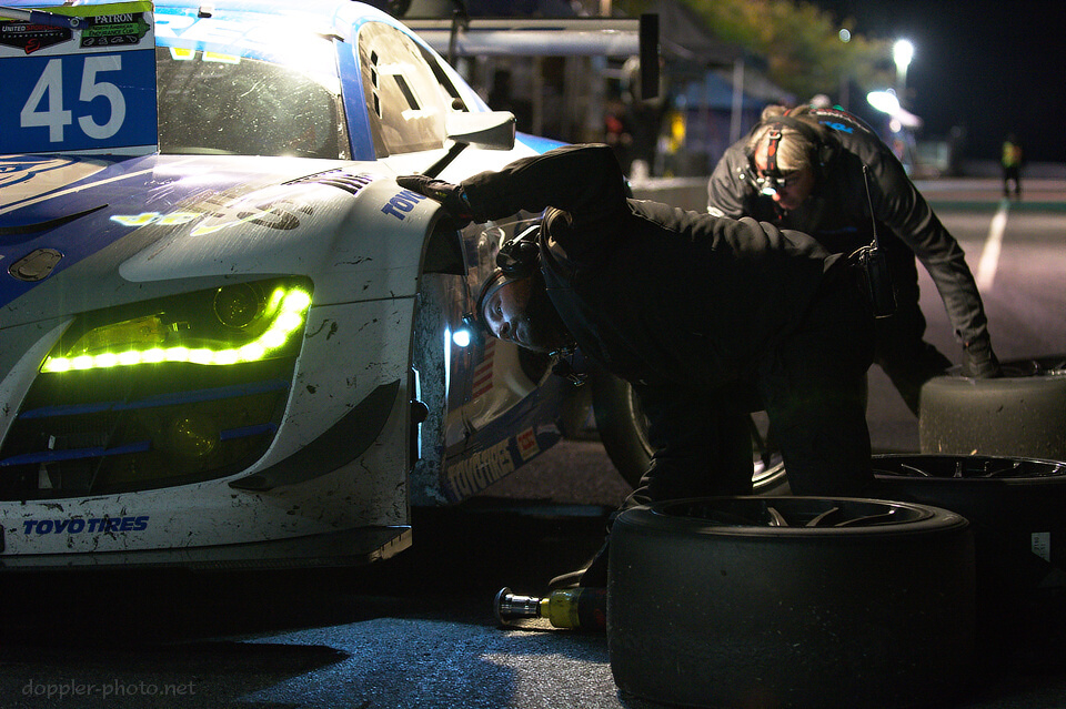 And when the rain finally arrived, it was a similar story. The still-hot slicks steamed as the rainwater evaporated into the cool night air. The wet-weather tires went on — less rubber to grab the track surface, but the gaps would let the rainwater get out of the way as the teams struggled to keep pace in the worsening conditions.