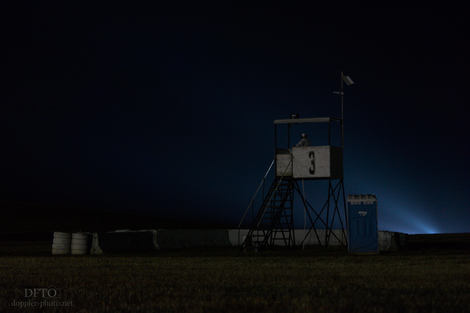 It can be surprising how far removed this vantage point is from the moment-by-moment rigors of actually supporting a vehicle. You see the cars zoom past at a distance, rather than from a foot away. The sound of them is more like music and less like a hammer against your ear. And when you look around, it's a brisk night sky. When the moon is up, its light caresses the features of the terrain surrounding the track. And when it's not, only a handful of widely-spaced generator lights lift the track out of the pitch black night.